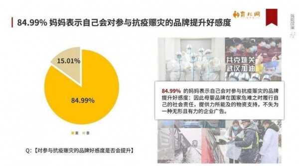 《報(bào)告》還顯示,84.99%的媽媽表示自己會(huì)對(duì)參與抗疫賑災(zāi)的品牌提升好感度。無(wú)論是緊急轉(zhuǎn)產(chǎn)口罩,還是疫情發(fā)生后第一時(shí)間組織捐款捐物,紙尿褲行業(yè)很多企業(yè)都在疫情期間展現(xiàn)出擔(dān)當(dāng)和責(zé)任。除了口罩、洗手液、消毒液等基礎(chǔ)防疫物資,很多紙尿褲企業(yè)向武漢等疫情重災(zāi)區(qū)捐出大量成人紙尿褲,解決了一線醫(yī)護(hù)人員的生理問(wèn)題。