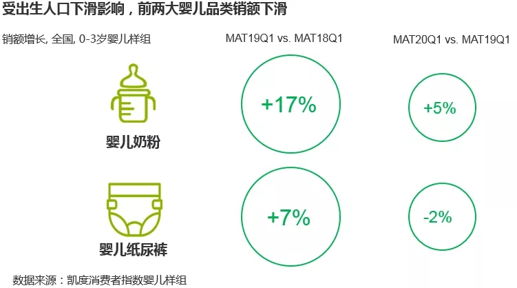 受到新生人口減少的影響,母嬰市場兩大頭部品類——奶粉和紙尿褲增長開始放緩。凱度消費(fèi)者指數(shù)顯示,2019年一季度嬰兒紙尿褲銷售額同比增長7%,但2020年一季度同比下滑了2%,這一部分下跌與年初的疫情事實(shí)上關(guān)系不大。多位資深從業(yè)者表示,即便身處動蕩的疫情環(huán)境下,消費(fèi)者對于奶粉、紙尿褲這樣的剛需產(chǎn)品的投入絲毫不會吝嗇。