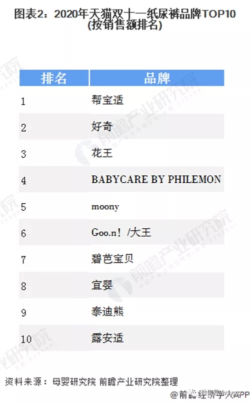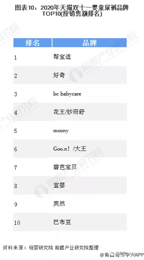 作為母嬰領(lǐng)域剛需、高頻的消費類目,紙尿褲需求量巨大,由于父母對于嬰幼兒健康愈發(fā)重視,消費者對于紙尿褲的品牌同樣重視。2020年天貓雙十一嬰童尿褲品牌TOP10中,幫寶適毫不疑問依然位居首位。