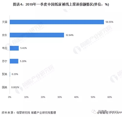可見,線上渠道是紙尿褲銷售的重要渠道。2019年第一季度,紙尿褲銷售額達(dá)48.1億元,同比增長12.6%。其中天貓平臺保持其“一哥”優(yōu)勢,銷售額27.2億元,占比56.5%。京東平臺銷售額15.7億元,占比32.6%,同比增長6.1%。在增長率上,考拉出現(xiàn)了20.2%的負(fù)增長,蘇寧實現(xiàn)了214.8%的超高速增長。.jpg)