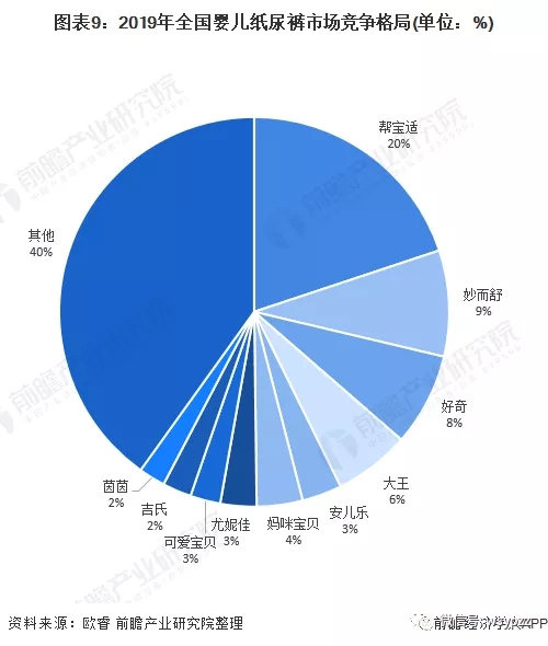 2019年全國嬰兒紙尿褲市場中,幫寶適以20%的市場份額遠(yuǎn)超其他品牌。排名前十的品牌市場份額為60%,品牌眾多,市場競爭相對激烈。