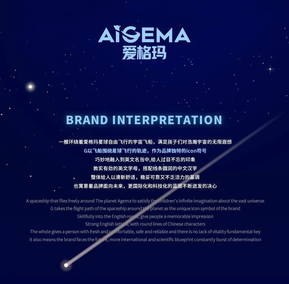 有故事的LOGO,飛船+星軌,小小星夢(mèng)從此開(kāi)始。愛(ài)格瑪星系宇宙,架構(gòu)起所有關(guān)于愛(ài)的哲學(xué)的童話意義。簡(jiǎn)潔內(nèi)趣,帶領(lǐng)品牌踏上愛(ài)的新征程。