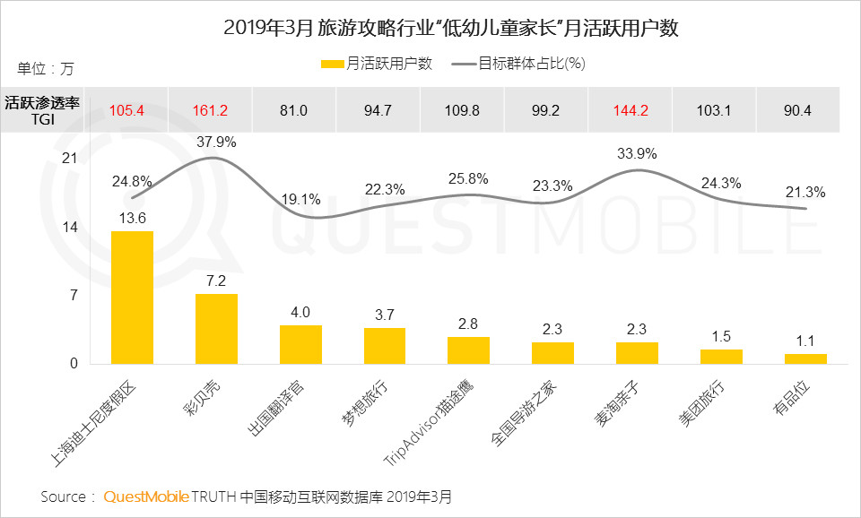 在親子旅游方面,隨著親子節(jié)目的熱播,讓近兩年親子游市場持續(xù)火爆。在旅游攻略APP中,彩貝殼目標(biāo)群體占比37.9%,其次為麥淘親子33.9%,而麥淘親子、上海迪士尼、彩貝殼等親子游類的旅游攻略受到低幼家長的青睞。從中可以看到隨著對教育要求的全面升級(jí),孩子的眼界和經(jīng)歷、親子陪伴也成為了父母關(guān)注的一大重點(diǎn)。