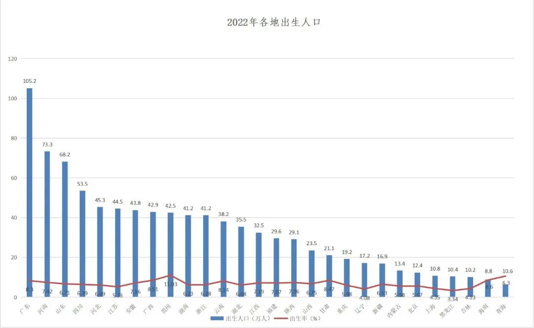 從部分經(jīng)濟(jì)欠發(fā)達(dá)地區(qū)看,出生人口同樣不容樂觀。以東北三省數(shù)據(jù)為例,2022年吉林出生人口為10.23萬(wàn)人,黑龍江出生人口10.39萬(wàn)人,遼寧出生人口17.2萬(wàn)人,三省出生人口合計(jì)跌破了40萬(wàn),僅為37.74萬(wàn)人,占全國(guó)比重僅為3.95%。常住人口合計(jì)超9600萬(wàn)的東北三省,去年出生人口不及西南的云南一省多。