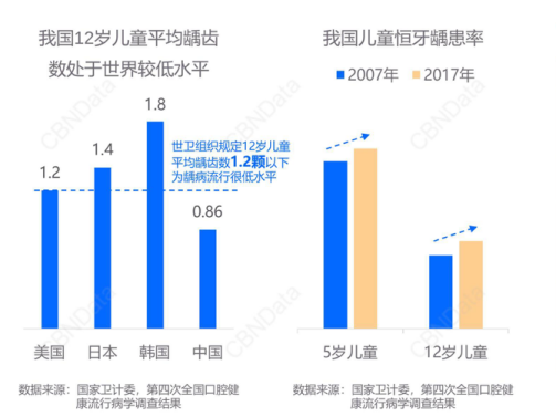 根據(jù)第四次全國(guó)口腔健康流行病學(xué)調(diào)查結(jié)果顯示,中國(guó)5歲兒童乳牙齲患(即蛀牙)率為70.9%,12歲兒童恒牙齲患率為34.5%。與十年前相比,5歲和12歲兒童齲患率分別上升了5.8%、7.8%。這也意味著,我國(guó)兒童口腔問題日益加劇。