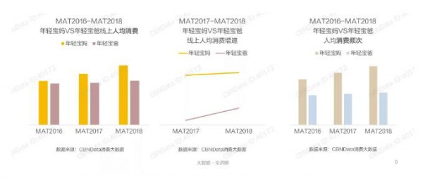 在更為開放、富足的環(huán)境下成長起來的80、90后年輕一代,大多受過良好的教育,生活水平也有所提高,他們在育兒觀念上更加開放,在包括紙尿褲在內的眾多母嬰用品上,年輕寶爸寶媽更舍得花錢,他們有強烈的消費意愿,還具備足夠的支付能力,成為母嬰消費市場的中堅力量。數(shù)據(jù)顯示,近年來,年輕寶媽寶爸的線上人均消費逐年提升。相比寶爸,寶媽的增速更快,達到兩位數(shù)的高速增長,消費潛力巨大。從消費頻次來看,年輕寶媽更愛剁手,他們的消費頻次遠高于寶爸。